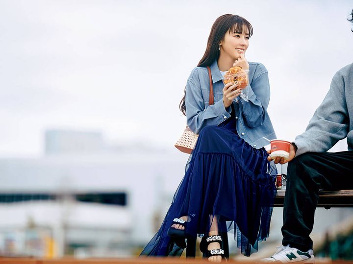 定番のGジャンよりもきれいめにデザインされたデニムジャケットなら、チュールワンピとすなんりなじむ絶妙なバランス。全体をブルーでまとめて甘めのチュールスカートを中和して。