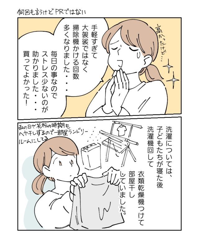 洗濯については、子ども達が寝た後に洗濯機を回し、衣類乾燥機をつけて部屋干ししていました。