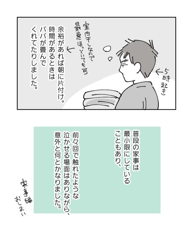 普段の家事は最小限にしていることもあり、泣いているへうくんを待たせて急いで家事を終わらせる・・・という場面はありながらも、意外となんとかなったのでした。