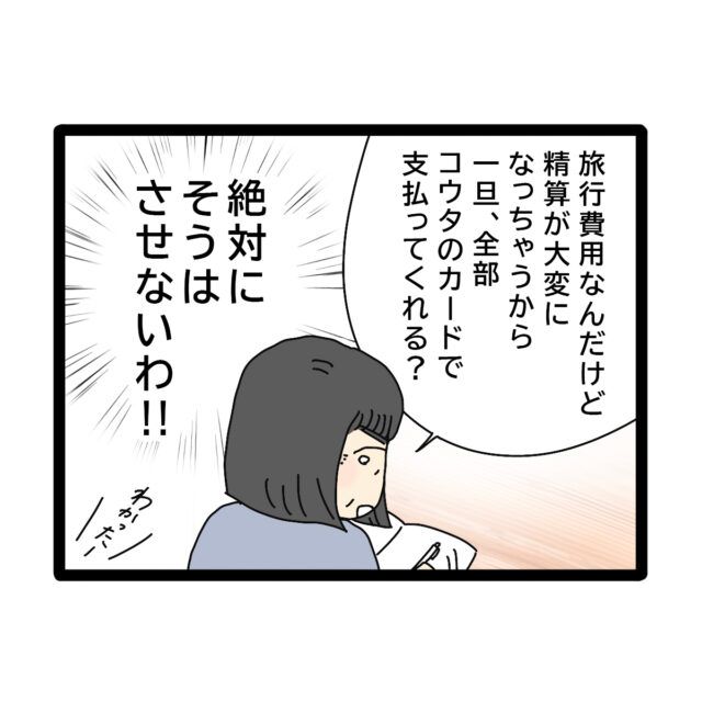 「旅行費用なんだけど、精算が大変になっちゃうから、一旦全部コウタのカードで支払ってくれる?」