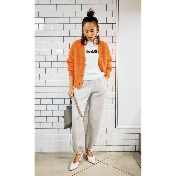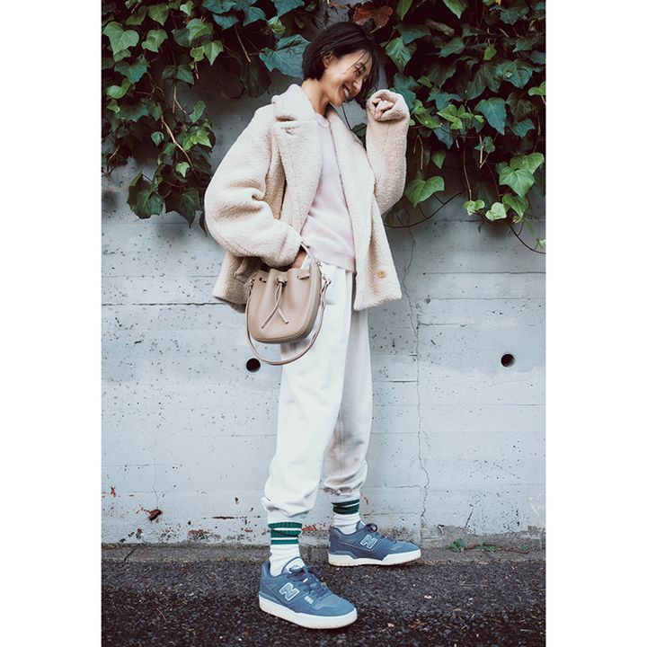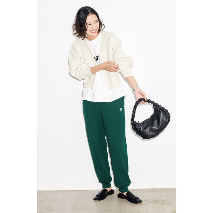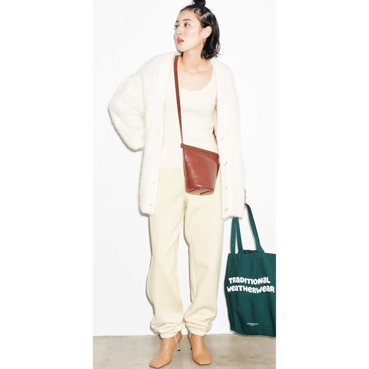 ふんわり白ニットの素材感で スウェットパンツがキレイ見え。 同系色でなじませてスッキリ