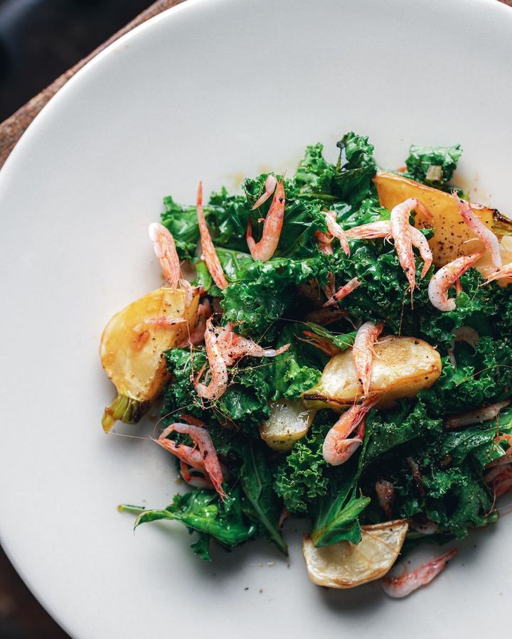 淡いピンク色の釜揚げ桜えび、ケールの緑、ごま油で香ばしく焼き色をつけたかぶ。