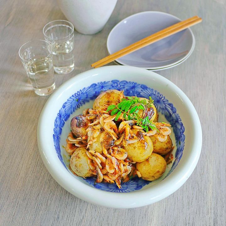 フライパンにバターを溶かし、釜揚げ桜えびと海苔の佃煮、電子レンジで火を通した皮付きの新じゃがをさっと炒めあわせて。