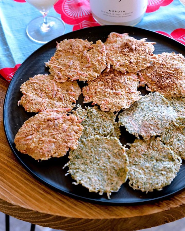 栄養価が高いオートミールに乾燥桜えびとごまをあわせておせんべいに。