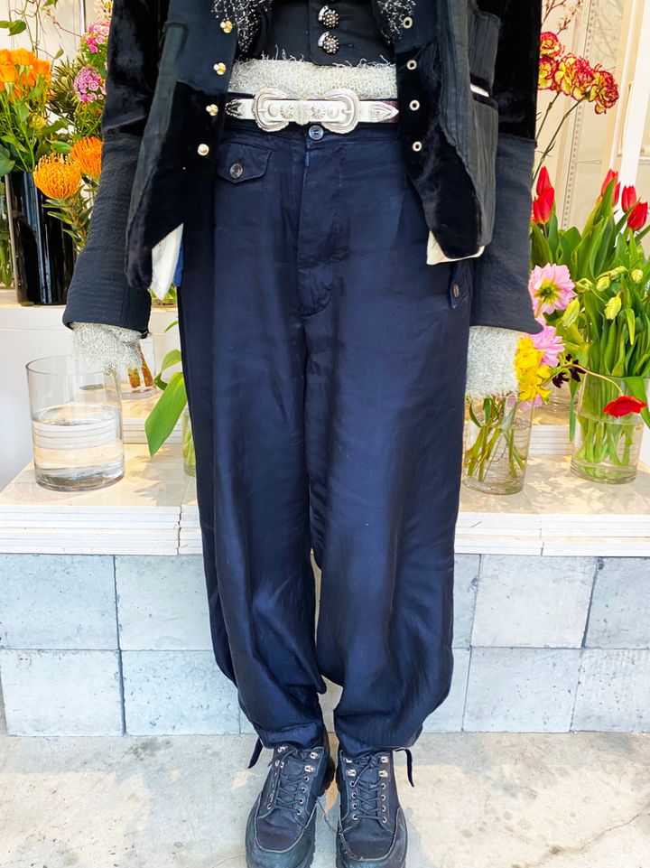 「1940年代のヨーロッパで用いられていたゴルフパンツをモチーフにしているエムエーエスユーのパンツ。古着から着想を得ながらコットンキュプラのサテン素材を使用することで、現代風に再構築されているところがグッと来ます」MASUのパンツは本人私物