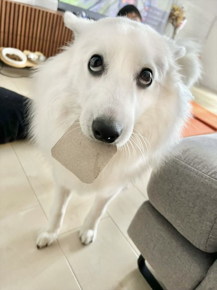 落ちているものを拾って飼い主さんのもとに行けば、かまってもらえると学習した日本スピッツ。 しかし、モノによっては拾うと怒られてしまうという事も知っているようで・・・、かまってもらおうとやってくる間も怒られないかドキドキしているみたいですよ!!