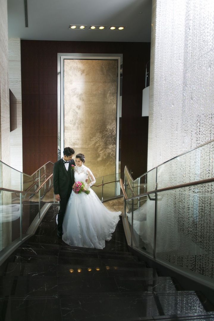 27階から29階を結ぶらせん階段からは、約10mもの長さを誇るシャンデリアが。月に照らされた天上の雲からゆっくりと降り注ぐ雨粒を表現しているのだそう。こちらでのフォトセッションも人気です。
