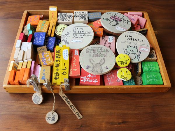 積み木はランダムに入っているので、けっこう探さないといけない時もありますが、これが意外と楽しい! 手書きのイラストや文字で、積み木一つ一つが違っていて個性であふれています。みんなでワイワイ言いながら積み木を探していると、会話も弾んで自然と笑顔に。子どもから大人まで、字が読めなくてもオーダーできる画期的でユニークなオーダーシステムです。