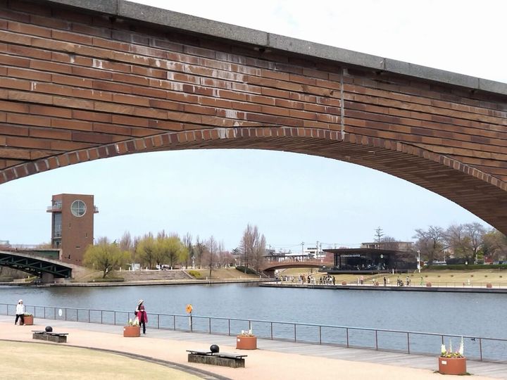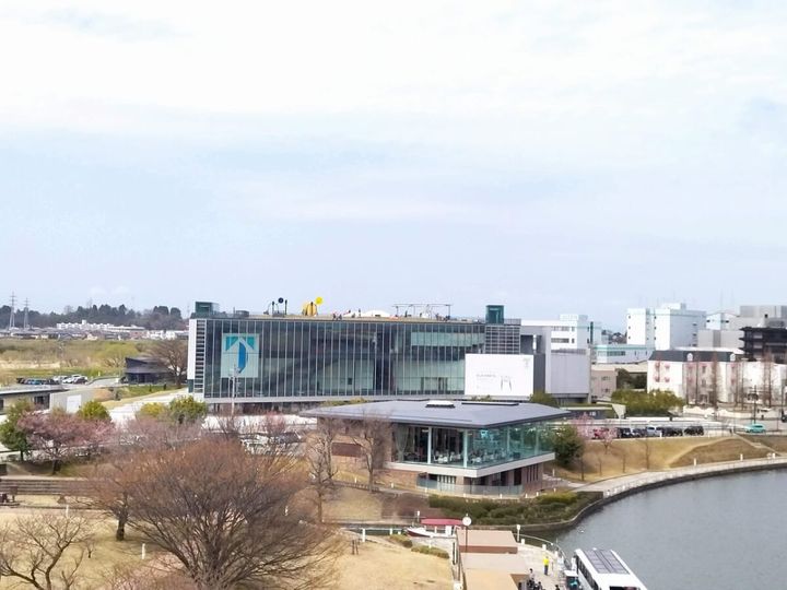 「オノマトペの屋上」へは、JRほか富山駅より徒歩15分の距離。街並みを楽しみながら出かけるには丁度よく、北口を出たら、水辺のどかな景観が広がる環水公園を目指します。園内を通り抜けると正面にガラス張りの富山県美術館があるので、屋上へ向かってください。
