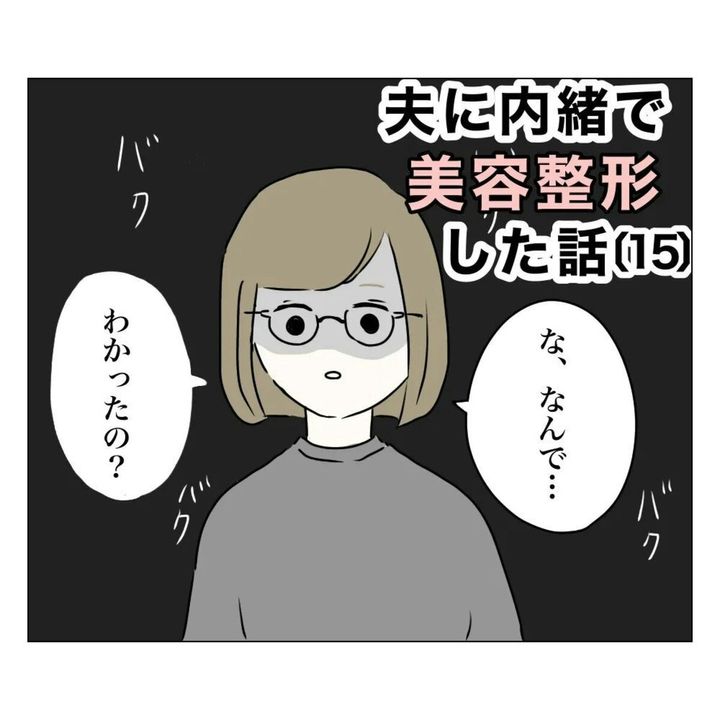 この漫画は、長年目の下のクマに悩んでいた作者・もいもい(@moimoimoi2712)さんが、美容整形に反対する夫を説得することはせず、秘密で美容整形をするお話です。無事手術を終え、目元を見ると整形に後悔はないと実感。その後、お母さんや夫に目元の変化を気づかれそうになるものの、何とかやり過ごし帰宅。そして息子の寝かしつけでそのまま寝てしまい、朝になり起きると、夫に美容整形がバレていたのでした。『夫に内緒で美容整形した話』第15話をご覧ください。