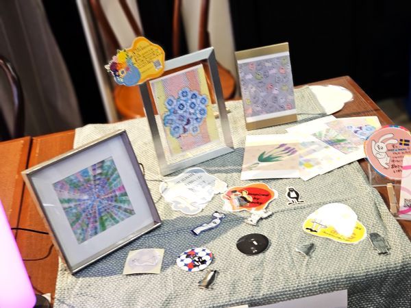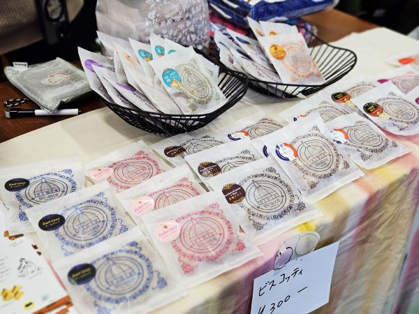 野菜やお菓子、お茶、イラスト作品やステッカーなどの販売があります。
