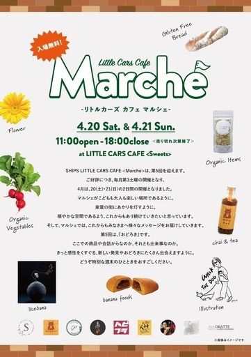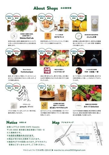 【LITTLE CARS CAFE <Marche>】(リトルカーズ カフェ マルシェ) 東京都江東区東雲1丁目6−8 LITTLE CARS CAFE <Sweets> 東雲駅より徒歩10分 豊洲駅より都バス「東雲一丁目」下車(11番乗り場よりバス停3つ目) 2024年4月20日(土曜日)~21日(日曜日) 11:00~18:00 ※入場無料 ※会計は現金にて(一部の店舗にて電子マネー使用可) ※商品が売り切れ次第終了 ※施設内1Fでの営業です(2Fでのカフェの営業はありません) 〈問い合わせ〉 marche.lcc.since2023@gmail.com