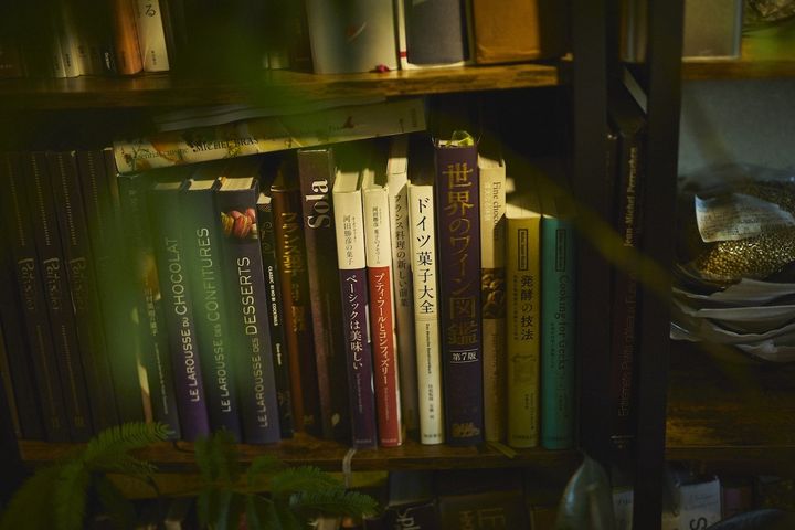 扉を開けると、中も一風変わった間取りになっていて、窓ごしに見える空間は2、3坪ほどの薄暗い小さな待合スペース。本棚にはドイツ菓子やフランス菓子、世界のワイン図鑑などのシェフの軌跡を思わせる本が並んでいます。そこからくるりと曲がる階段を数段上がってメインの空間へ。席に着くまでのアプローチにも気持ちが高まります。