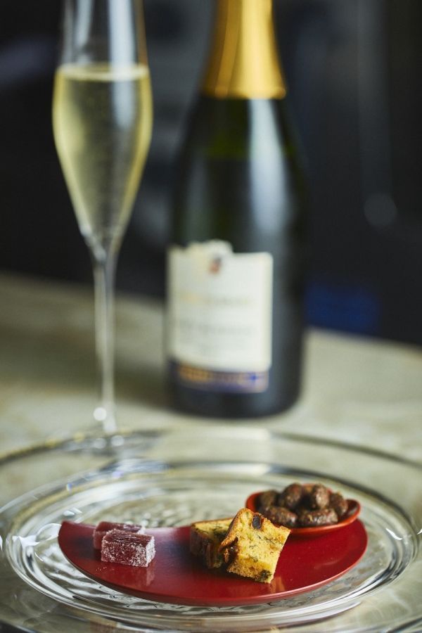 アペリティフに合わせて提案していただいたのは、フランス・アンザス地方で“最も野心的なワイナリー”と評価される「Amelie & Charles Sparr(アメリー シャルル スパー)」のスパークリング。塩味の小菓子とアペリティフは物語への導入。これから続く甘い世界を味わい尽くすために、食べる人の舌を整える役目を担っています。