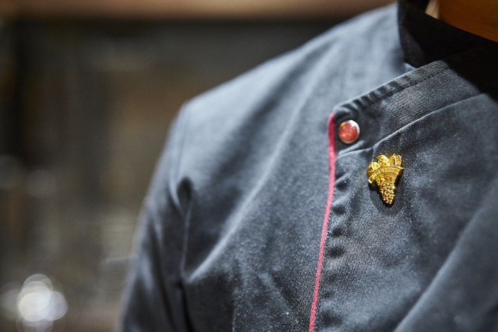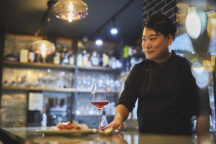 店内の幅広いカウンターには6脚の椅子のみ。このカウンターが客席と厨房を分け、どちらの後ろにもゆったりとした空間がとられています。カウンター越しにおもてなしをしてくれるのが山本智弘シェフ。新時代の若き才能を発掘する、日本最大級の料理人コンペティションと銘打たれた「RED U-35」でSILVER EGGに選ばれた経験を持つ奇才です。