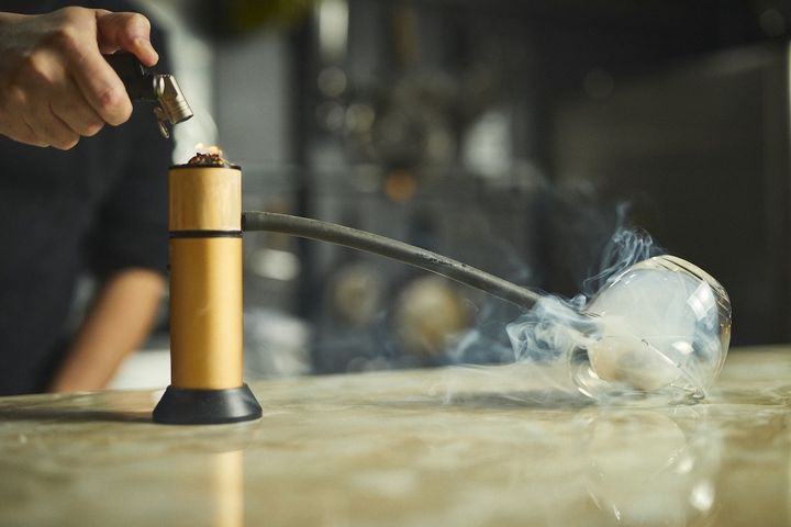 カウンター席の楽しみは、デザートが作り出されていく過程を目の前で見られることにあります。メニューには3皿目は「ショコラ」と書かれていますが、出てきたのは謎の器具。コレは何かというと室内用燻製機。