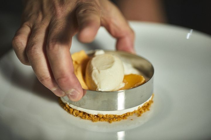 クランブル生地のタルト台の上にトンカ豆のムース。トンカ豆はフランスで料理やお菓子だけではなく香水にも使われる独特の甘い香りが特徴のスパイスです。その上にクリームブリュレとお米のアイスを重ねます。