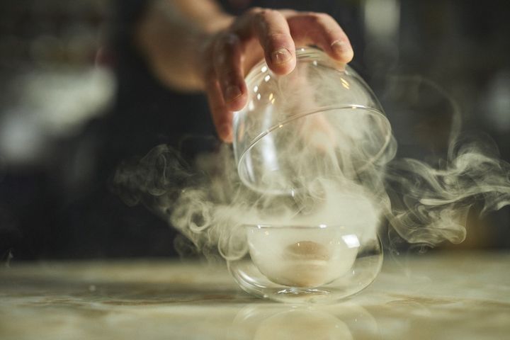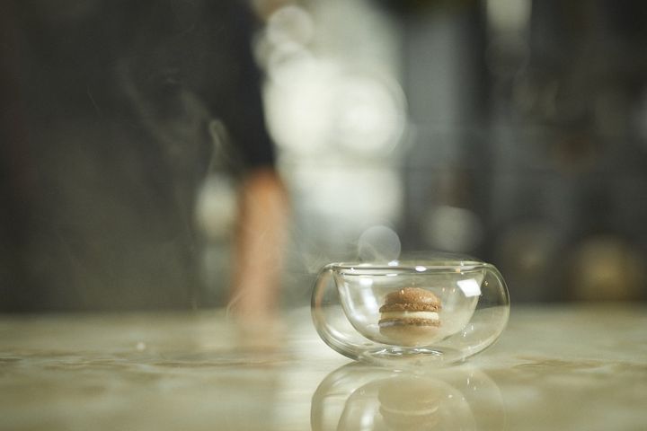 桜のチップを燻製した煙が、細い管を通してガラスの容器の中にもくもくとはきだされます。その間、およそ30秒。薫香で満たされた容器の蓋を開けると中から出てきたのはマカロン。