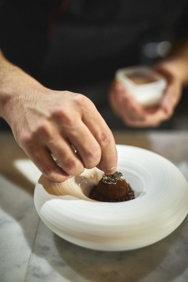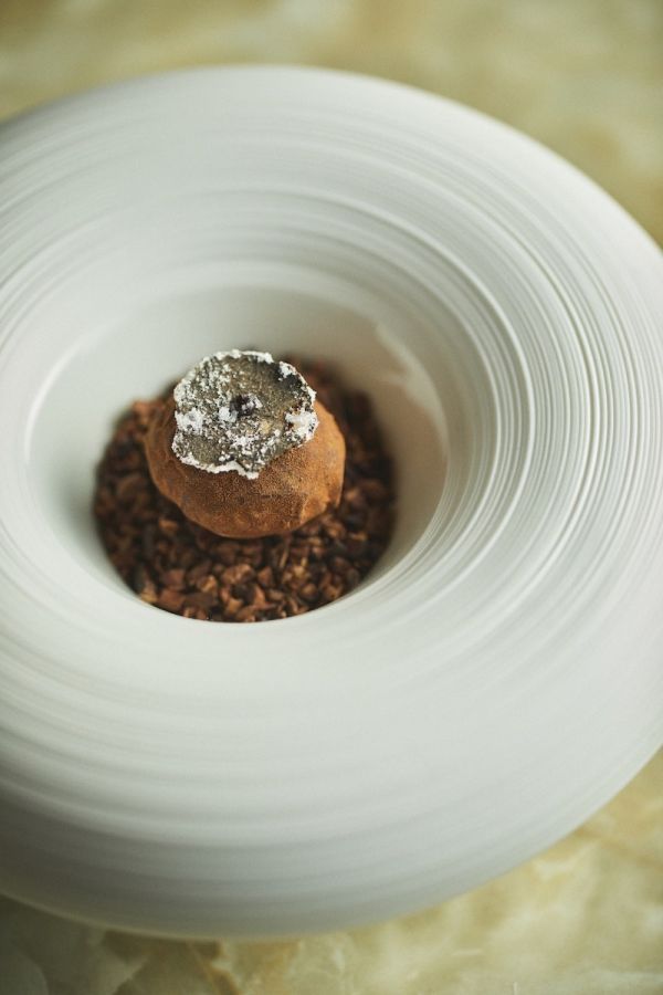 季節により、日により内容の変わる料理のなかで定番化するほどに人気を集めるのが「トリュフのトリュフ」。名前のとおり世界三大珍味のひとつトリュフをふんだんに使ったひと皿です。フランス料理にも使われる高級トリュフをホワイトチョコレートのガナッシュに合わせてカカオパウダーでコーティング。