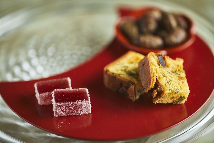 真ん中はケークサレ。こちらは「京つけもの 西利」の漬物を使用しています。この日はかぶらの漬物。内容は季節により変わります。奥はアーモンドのキャラメリゼ。京土産の定番として昔から愛される「七味家本舗」の七味が隠し味に。京都の街中を走り回って集めた季節の手仕事の食材をお菓子の素材に用いるのが「Dessert&Wine 西洋茶屋 山本」の特徴です。