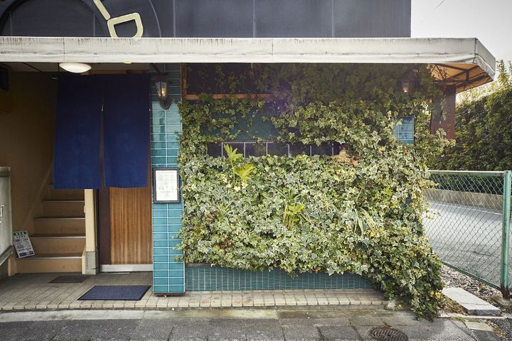 レトロな雰囲気を醸し出すビルの1階にあり、蔦で覆われた壁に貼られたターコイズブルーのタイルが印象的な外観。