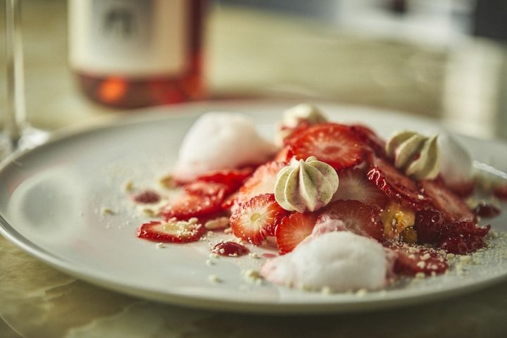 斬新なのがイチゴのスライス。薄く均等にカットされたイチゴが桜の花びらが舞うように皿の上に散りばめられます。選ばれたイチゴは京都府亀岡産の「紅ほっぺ」。甘さも酸味も強いイチゴです。飾りに添えられるのはレモンの香りがするベルベーヌ(レモンバーベナ)のメレンゲとココナッツの泡。はなやかさと繊細さを兼ね備えた美しいひと皿です。最後はお茶菓子で〆る計5皿。コスパもよく、大満足の内容です。