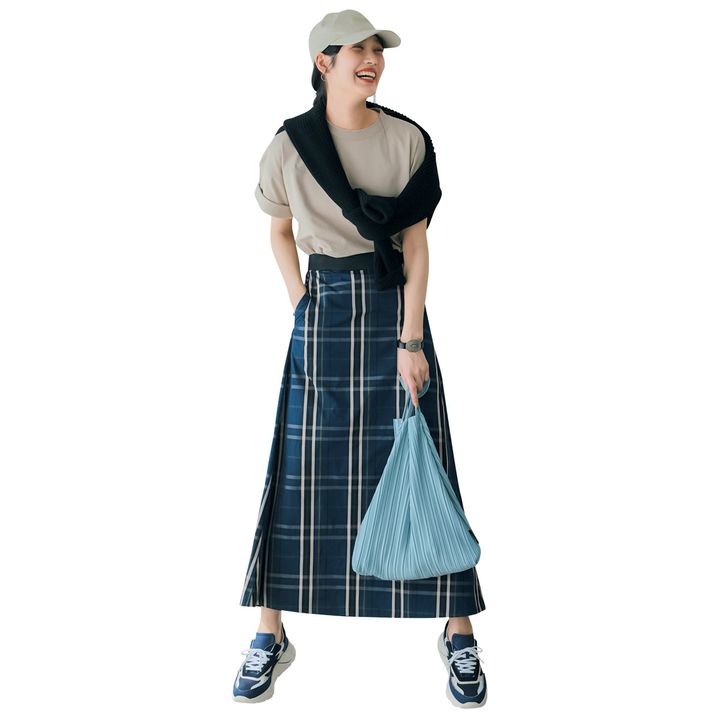 [NAVY]モード感のある素材やスマートなフォルムなど、今っぽい要素を投入して洒落感を増量。両サイドには便利なポケット付き。チェック柄スカート¥19,800(スリースクエア)Tシャツ¥11,000肩にかけたニット¥34,100(ともにスローン)キャップ¥13,200(オペラスポーツ/エストネーショングランフロント大阪店)ピアス¥88,000 (ウノアエレ/ウノアエレ ジャパン)ブレスレット¥7,700(レフィエ/フラッパーズ)スニーカー¥39,600〈デイト〉バッグ¥5,940〈ブルーオーブ〉(ともにティースクエア プレスルーム)