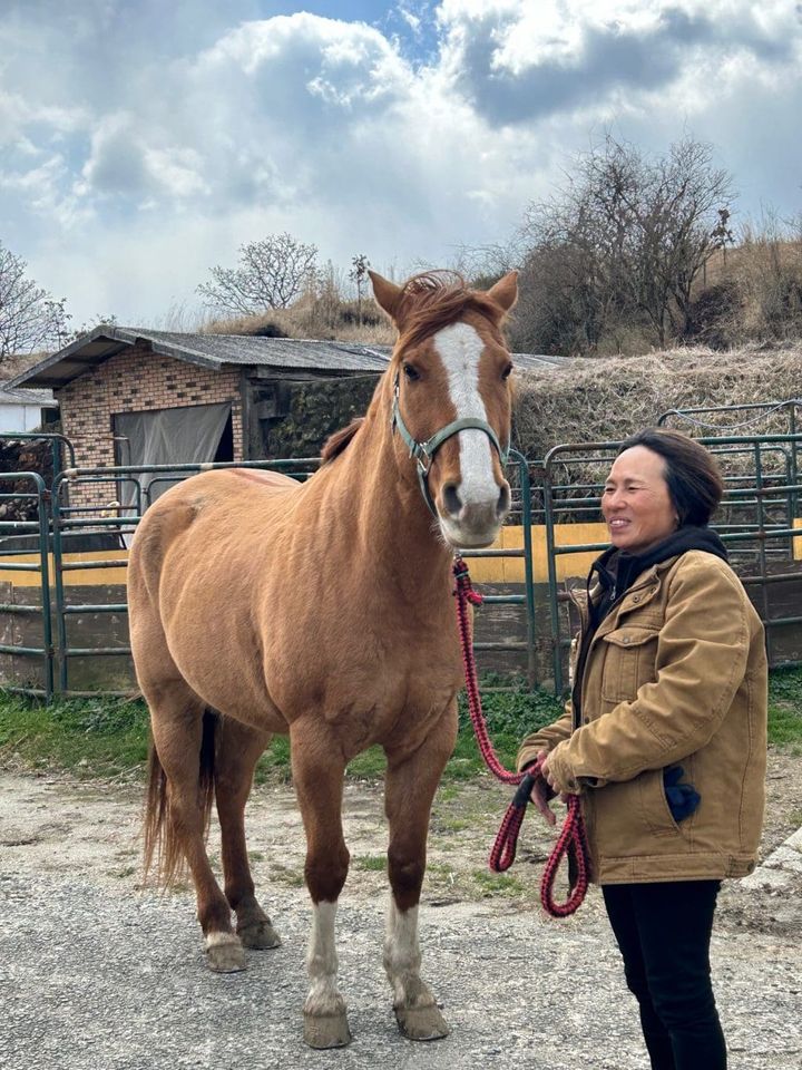 こちらにいる馬は、アメリカンクォーターホースという種類で、馬の方までの高さである鬐甲(きこう)が147㎝ほどの小柄な馬。小さいけれどパワーがあって心が広く、乗馬に向いている馬なんです。阿蘇の草原で多頭放牧されているため、馬は自然に上下関係を学び、人間の指示にも従ってくれます。