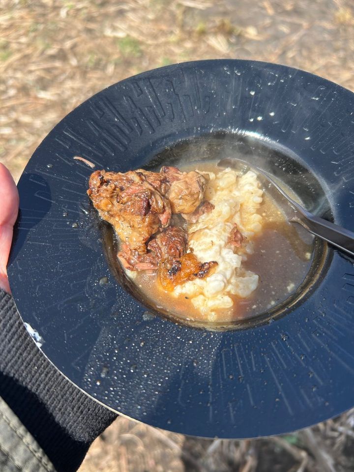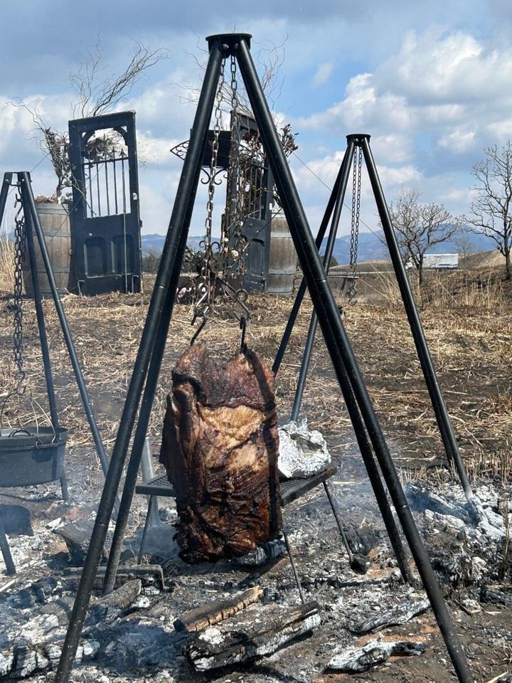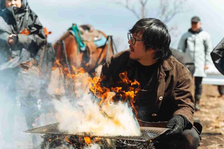 野焼きが終わったばかりの草原で、今回特別に企画されたのが、草原でのアウトドアダイニング。熊本市内で薪や炭火を使った料理を提供するレストラン.know(ノウ)の鍬本峻さんによる、スープから前菜、薪を使ったバーベキューなどの全7品をいただきました。