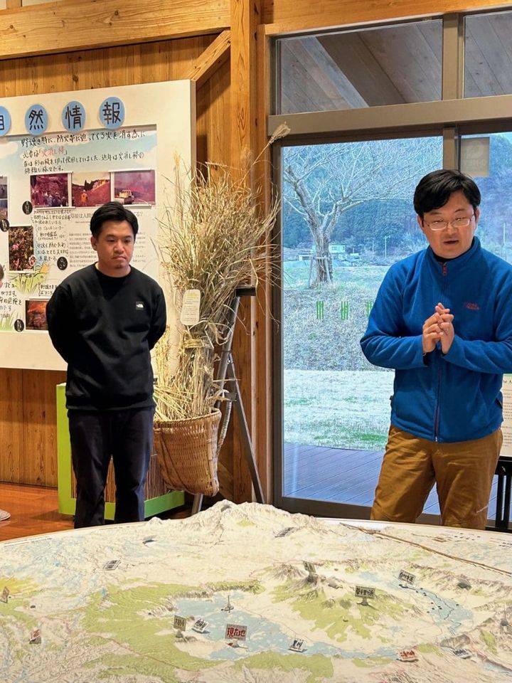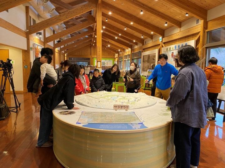 館内には、阿蘇のカルデラの大きな模型があります。それを見ながらお話をしてくれたのは、阿蘇グリーンストックの増井太樹さん。阿蘇グリーンストックは、阿蘇の草原を守るボランティア活動に取り組んでいます。