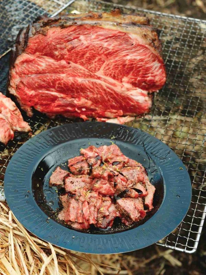 赤身のお肉を切り分けて、参加者みんなでいただきます。草原の風に吹かれながら、阿蘇のクラフトビールとともに、いただくうまみの強い赤身のお肉……至福の時間です。