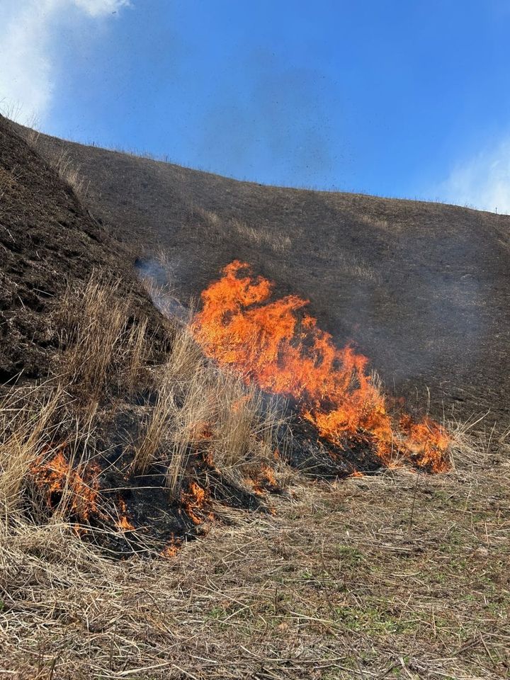3月中旬の野焼きシーズンだったこの日は、特別に野焼きのデモンストレーションが行われました。冬枯れた草にはサッと火がついて燃え上がり、すごい迫力です。表面の草を焼くだけなので鎮火までは一瞬で、火が燃え広がらないように工夫されています。野焼きで表面の草がなくなることで、地下に埋まった芽生えや種に光が届き、芽吹きの春を迎えるのです。