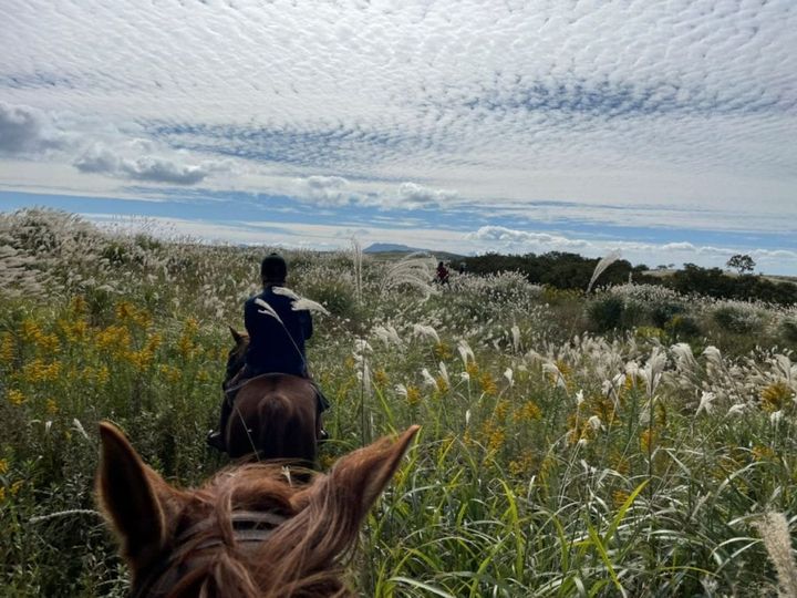 草原に吹く風やざわめきを、間近に感じたいなら、乗馬体験がおすすめ。草原は牧野と呼ばれる地域資源でもあるため許可のない立ち入りは禁止されています。そんななかで、牧野の中で、乗馬ができるのが夢・大地グリーンバレーです。