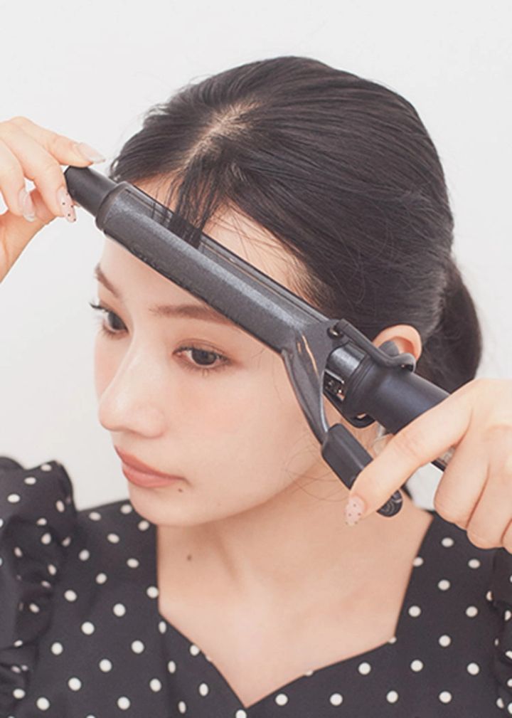 片側の前髪を少量引き出し、28㎜のアイロンでカール。