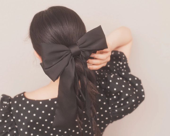超ビッグサイズの黒リボンは、すっきりしたポニテとのコンビで顔まわりにメリハリを出して小顔効果をGET!ポニテにツイストを加えると、大人っぽなしゃれ感も手に入る。