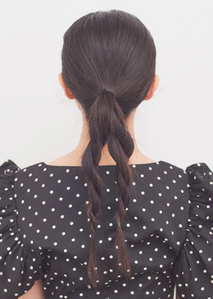 最後にポニテの根元に、細リボンを結んで垂らし、リボンバレッタをつける。