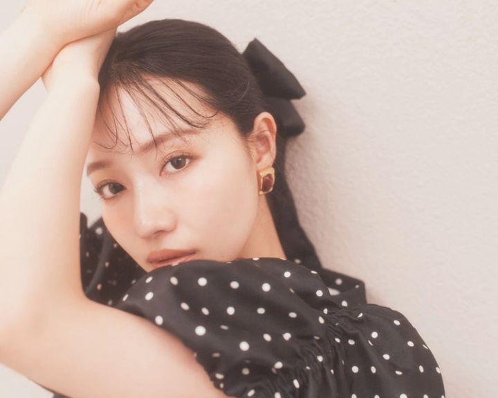 黒ビッグリボンバレッタ 659円/WEGO 髪に結んだ細リボン/スタイリスト私物 ドットトップス 11,990円/RANDA イヤリング 5,250円/アビステ
