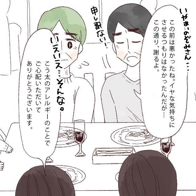 ショックなことを言われて義両親の顔が見たくなくなってしまい、しばらく義実家を訪れていなかったある日、孫にどうしても会いたい義母から夫へ電話がきました。夫は義両親に、私を責めるようなことは言わないように言ってくれました。また、息子のアレルギーは好き嫌いではないのだともう一度伝えると、「わかってる」と言うとともに、私に会って謝罪したいと言っていました。本当は会いたくなかったけれど、しかたなく一緒に食事をすることになりました。
