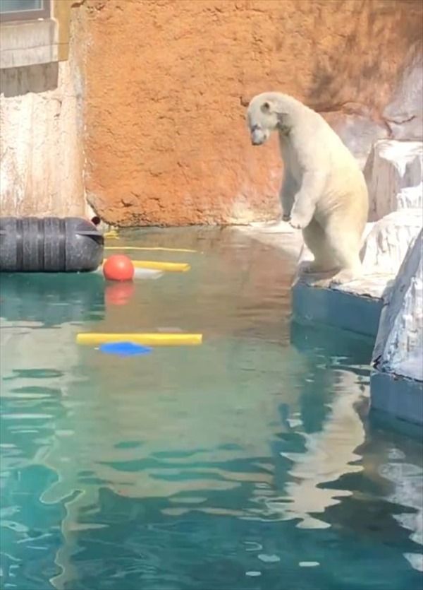 天王寺動物園(大阪市天王寺区)のホッキョクグマ『ホウ』ちゃんが入水するシーンの動画なのですが、ホウちゃんの左足に注目が集まっていました。