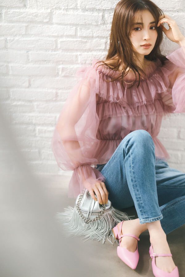 パウダリーなくすみピンクなら、大人女子の着こなしにほどよい甘さをプラス。カジュアルなデニムを合わせればチュールの肌見せとピンクのほどよい甘さで好バランスに。