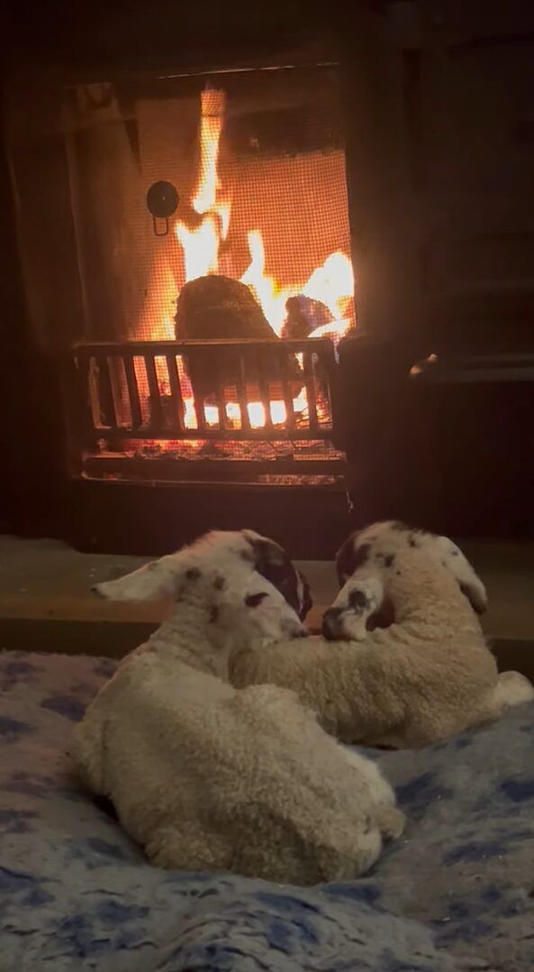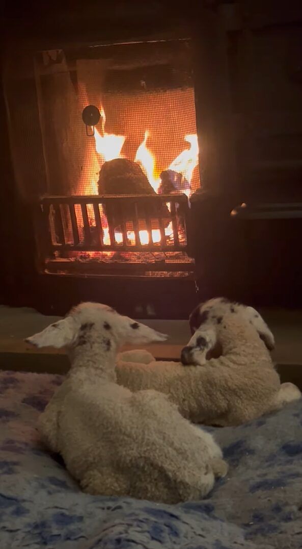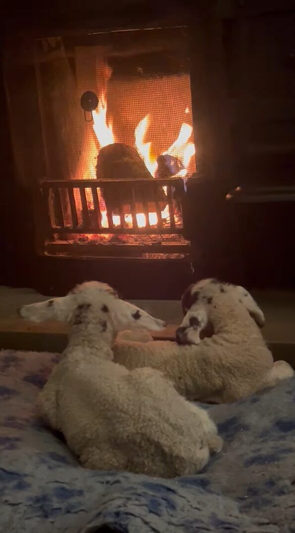 暖炉の前から動く様子のないヒツジの赤ちゃんたち。 この子たちは親を亡くしてしまったこともあり、撮影者さんたちが面倒を見ているそうです。