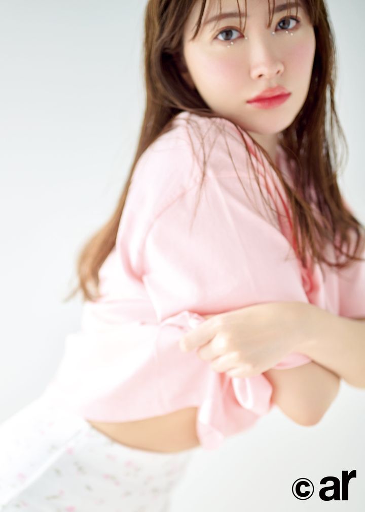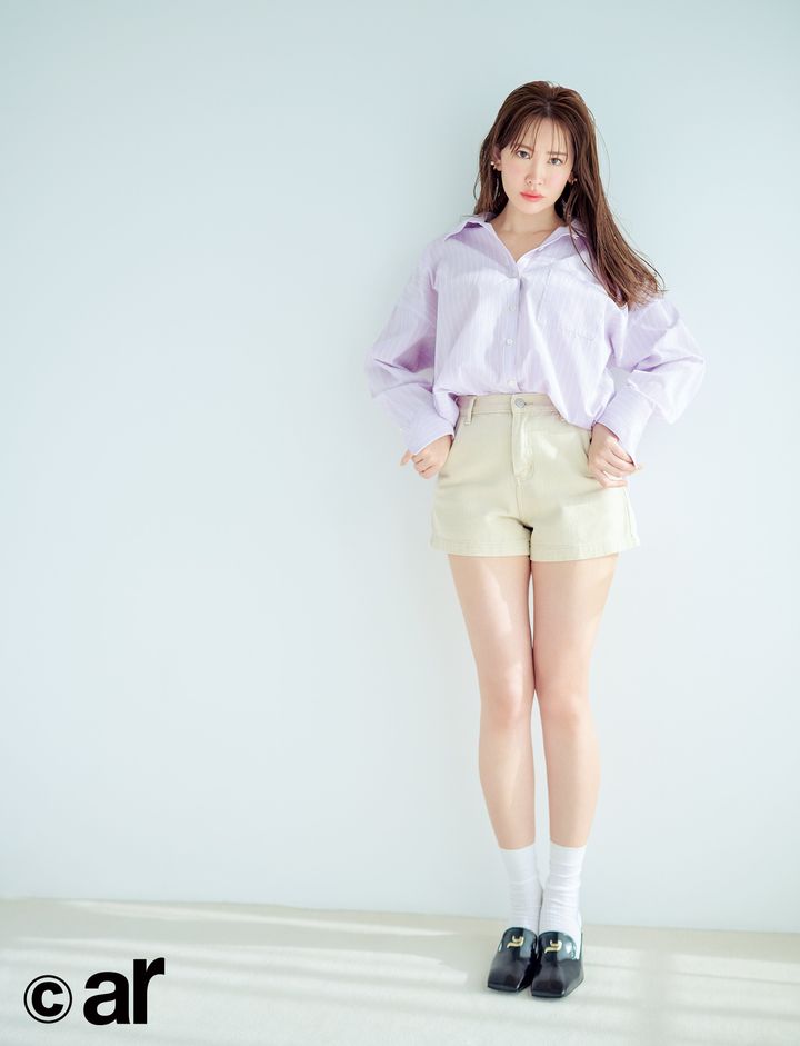 小嶋陽菜。ar3月号より シャツ¥14,000/ハーリップトゥ ショートパンツ¥5,800/Olu. イヤリング¥5,720/ピンクオウルビジュー( ロードス) シューズ¥63,800/イエイエ(ショールーム シャルメール) ソックス/スタイリスト私物