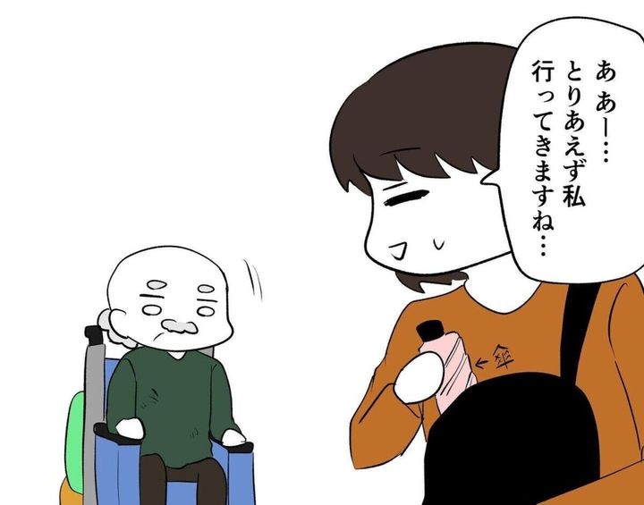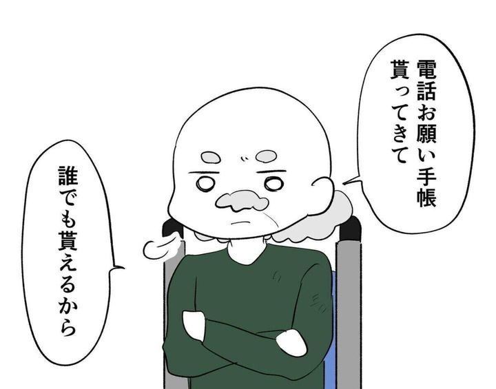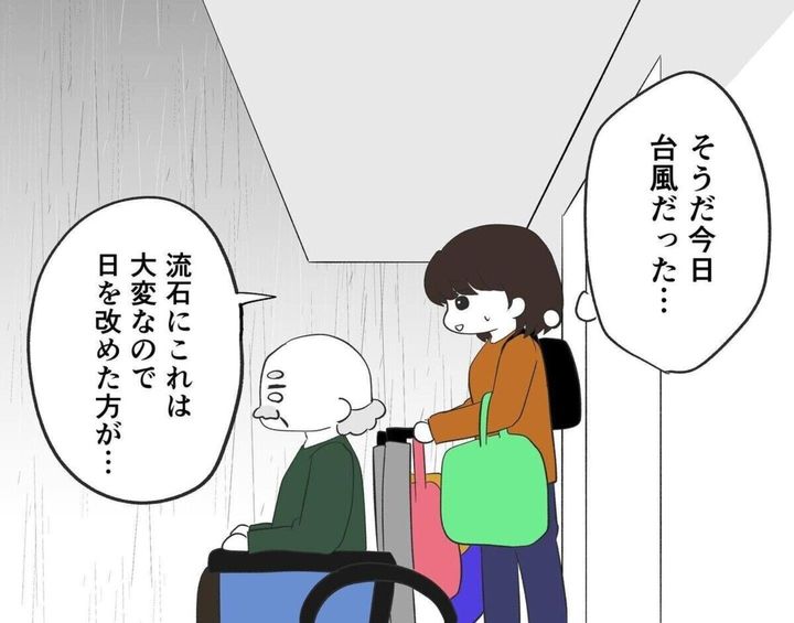 大荒れの中、市役所に行きたい理由は「電話お願い手帳」が欲しいからでした。どうやら男性にとっては大切なもので、ないと困るようです。理由を察した主人公は、台風の中、市役所へ行くことを決意します。