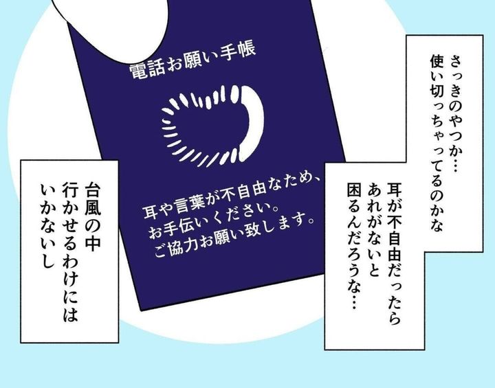 台風予報で大荒れの日、急いで帰宅するために駅へ向かっていました。すると、困っている様子の男性に「電話お願い手帳」を差し出されます。どうやら男性は、耳や言葉が不自由な様子です。