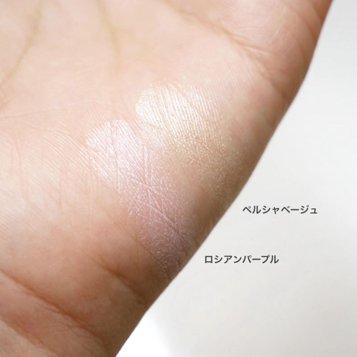 ペルシャベージュにはオレンジリップ、ロシアンパープルには深いレッドブラウンのリップを合わせてみました。どちらもクッションファンデでベースメイクを作ったあと、ヘアセットまで終わらせてからバランスを見てハイライトを指先で塗布!内側からじゅわっと滲み出るようなツヤが簡単に作れるのに、表面はサラサラ!髪が張りつくこともなく一日快適に過ごせました。