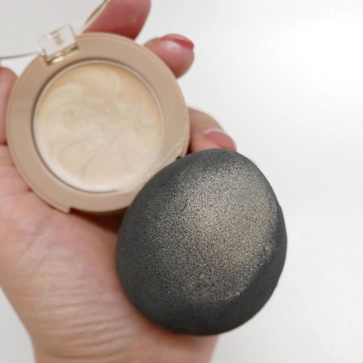 パフで塗る場合はこのくらいの量を取ります。軽く表面をサッとなでて取れる量です。