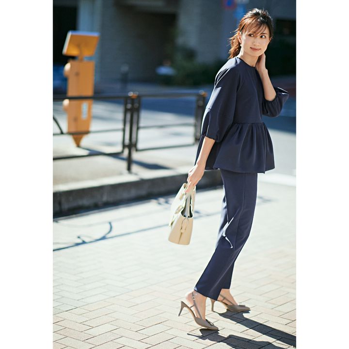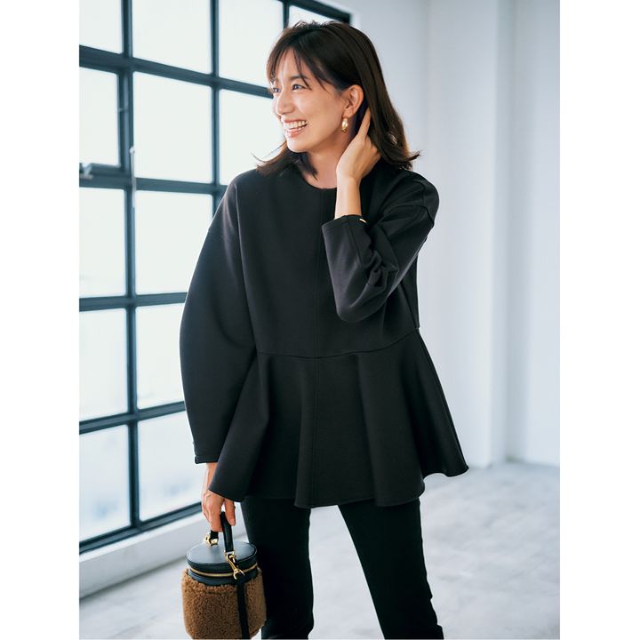 立体感のある袖とストンとしたシルエットのペプラムが今っぽい。ランチやショッピングにも重宝しそうな黒は、授業参観後にママ友とお茶、なんて流れにも焦らず対応できます。トップスはスリースクエア、パンツはヤヌーク、バッグはヴィオラドーロのもの。