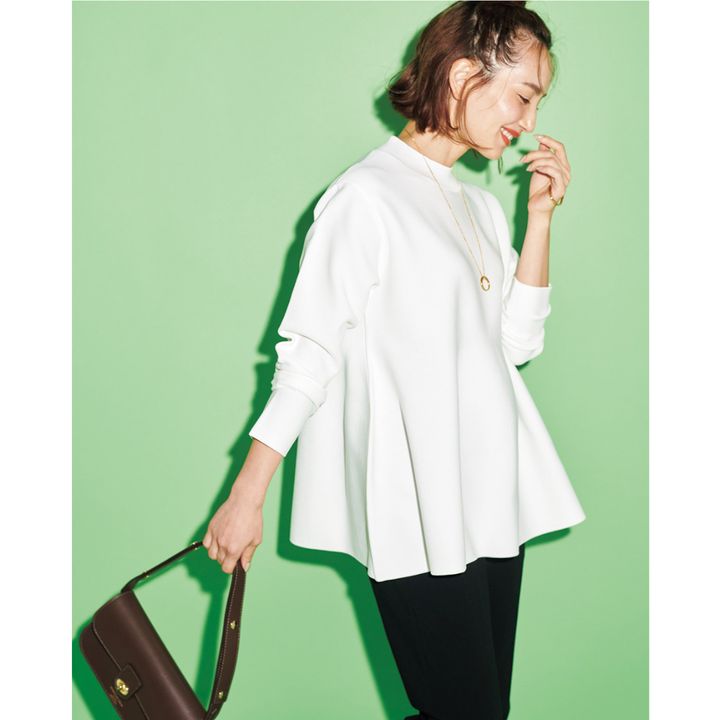 ふんわりデザインがシンプルなパンツを品よく可愛げに仕上げてくれるうえ、お腹やお尻周りをカバーできるところも心強い。形が甘いので、スウェットやポンチなど、カジュアルな素材でも問題ありません。