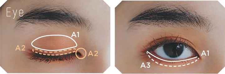 A1をアイホールに広めに塗る。A2の赤茶をアイラインがわりに入れ、さらに目頭の切れ込み部分にもオン。