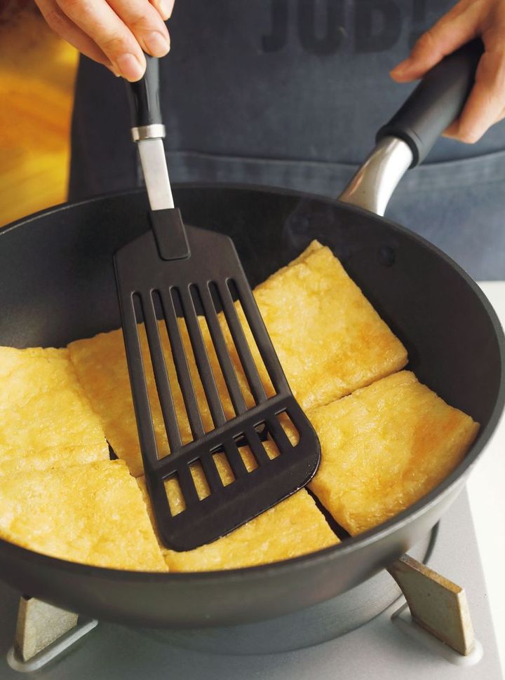 フライパンに油揚げを入れて強めの中火にかける。フライ返しなどで押さえながら、両面を2分くらいずつ焼いて取り出す。